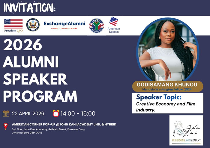 The U.S. Mission South Africa, in collaboration with SAUSAC, American Spaces, and the John Kani Performing Arts Academy, will host the 10-month Alumni Speaker Programme Series from March to November 2026, featuring distinguished alumni of U.S. Government exchange programmes.